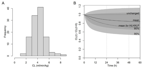 Inter- and intra-individual variability of busulfan CL based on the final model (Table 3) at the subject level. (A) Distribution of CL normalized to W in mL/min/kg at the start of therapy. (B) Simulated CL(t) normalized to the start CL (CL(t = 0)). Light gray area, predicted CL(t) within the 95% confidence interval; dark gray area, within the 80% confidence interval; solid line (“mean”), simulation from fixed effects (dk, ln(κk)); broken line, simulation from fixed effects for diagnosis group HLH/XLP; horizontal dotted line, unchanged CL over t; vertical dotted lines at 24 h and 48 h.