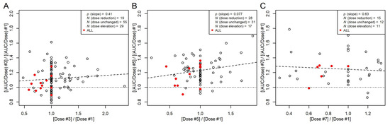 Ratios between non-parametric AUC/dose from the third (A), fifth (B), or seventh (C) dosing interval and AUC/dose at the first dosing interval plotted against the respective dose ratios. Filled red symbols, patients with ALL. Broken line, linear regression between the AUC/dose ratios and dose ratios with a p-value for the slope, indicating that the slope is not significantly different from 0. Dotted line, ratio of 1. Data with AUC measurements of even dose numbers are not included (N = 11). This includes one patient with ALL without dose adjustment.