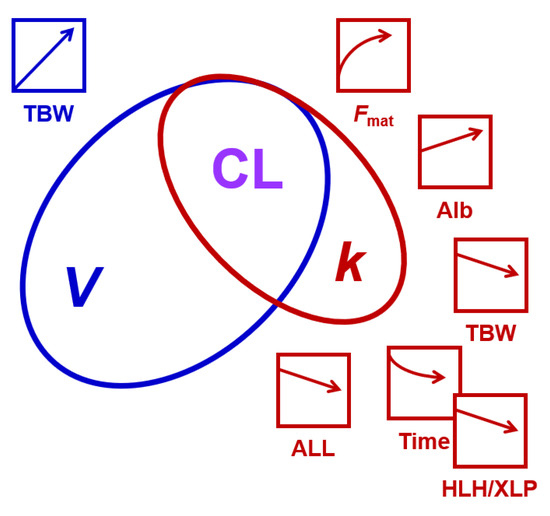 A schematic summary of the findings of this study. CL equals the product of V and k. V had a higher variability in the study population than k, as indicated by the size of the ellipses. The effects of patient characteristics on V and k, and thus CL, are indicated by the arrows and the respective color (blue, influencing V; red, influencing k). HLH/XLP amplifies the time-dependent reduction in k (indicated by the overlap of the respective symbols). Alb, albumin; ALL, acute lymphoblastic leukemia; Fmat, maturation function of busulfan elimination process(es); HLH/XLP, hemophagocytic lymphohistiocytosis/X-linked lymphoproliferative disease; TBW, total body water. The artefactual effect of infusion time is not included.