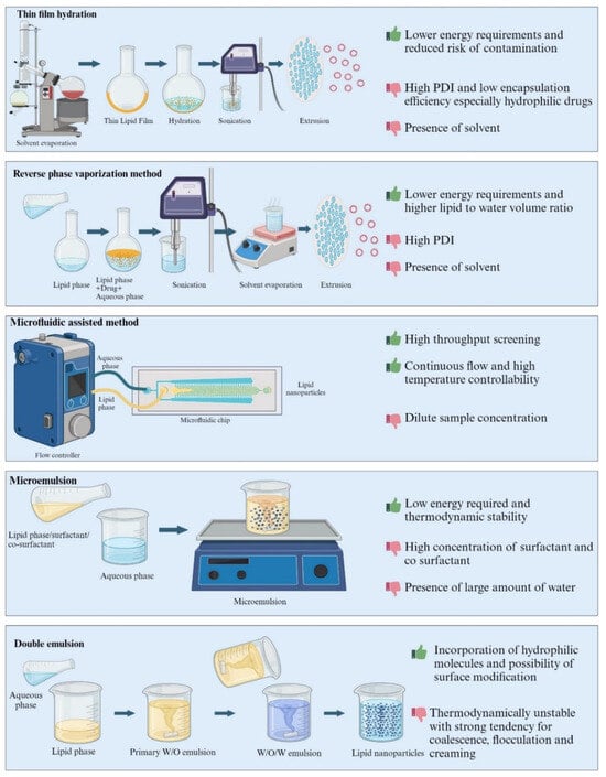 The lipids are dissolved in a low-boiling-point organic solvent and subsequently mixed directly with water or a buffer that contains a water-soluble drug. By utilizing a low-pressure rotary evaporator, the organic solvent is evaporated, and the proportions of both phases are reversed, which generates lipid nano-liposomes dispersed within the aqueous phase. Extrusion or sonication methods can be employed to achieve a reduced particle size and promote mono- and polydispersity in preformed LUVs and MLVs [49].