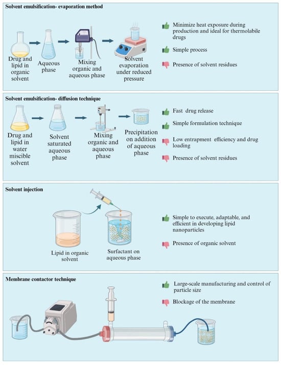 In this method, the drug and lipids are solubilized in non-polar organic solvents such as toluene, cyclohexane, dichloromethane, or chloroform. Emulsification is then performed in an aqueous phase with the use of a high-speed homogenizer. Finally, the organic solvent is removed through stirring at room temperature (298.15 kelvin) under reduced pressure (4000–6000 pascal). Mechanical mixing at a reduced pressure and temperature causes the precipitation of lipids, resulting in the generation of lipid nanoparticles [59]. This method is appropriate for encapsulating heat-labile drugs. Nevertheless, it may be challenging to completely remove organic solvents, especially if the lipids are not very soluble in the solvent. This can potentially lead to toxicity by residual solvents.