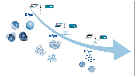 The basic setup is similar to the electrospinning technology and consists of a high-voltage power supply, a syringe with a metallic needle connected to a syringe pump and the grounded collector (Figure 2). During the electrospraying process, electrical forces overcome the surface tension of the droplet under the influence of an external electric field. Moreover, solvent evaporation allows the collection of solid particles. The size, morphology, and surface of particles can be modified and controlled by process parameters such as flow rate, applied voltage, and polymer concentration [31,60]. For instance, different morphologies of particles, such as spheres, donut-like, and corrugated shapes with sizes ranging from several tens of microns to hundreds of nanometers, were observed to be influenced by polymer molecular weight and concentration, solution flow rate, voltage, and solvent [61].