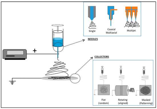 Basic scheme of the electrospinning process and setup implementation by tailored needles/collectors.