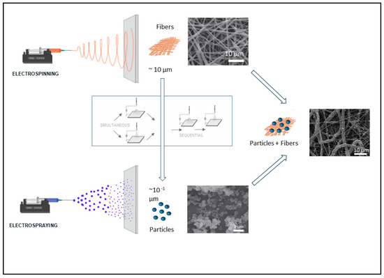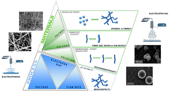 Schematic map of materials and main process parameters used to control the morphological properties of products via electrospinning and electrospraying techniques. Pictures were adapted with permission from [45,46].