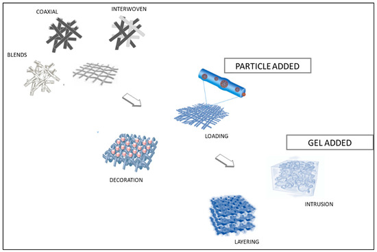 Nanoparticle (NP) loading within electrospun micro/nanofibers allow the obtainment of functional hybrid fibers with empowered features provided by both NPs (guest) and polymer mats (host). This strategy results in a synergistic combination between the functional features of NPs (e.g., small size, high surface:volume ratio and chemical reactivity), along with flexibility and porosity of the polymer mats. Viscosity, spinnability and resultant composite nanofiber morphology are among the main parameters affected by NP loading and distribution within the polymer solution. Therefore, an NP clustering effect needs to be avoided by means of physical methods (e.g., stirring, sonication), chemical modification (e.g., surfactants) to improve colloidality of NPs, or dissolution of NPs and polymers in different solvents. Several NPs have been successfully embedded within micro/nanofiber mats, including metal [113,114], metal oxide [114], and carbon-derived [115] and polymer-based NPs [116]. NPs can be incorporated within electrospun micro/nanofibers by three main routes. The most used is direct blending electrospinning, where the NPs are directly added to the polymer solution prior to electrospinning [116,117].