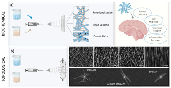 Different technological setups to impart (a) biochemical and/or (b) topographical cues in blended fibers to support brain regeneration. Pictures adapted with permission from [87].