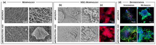 (a) Morphological characterization of 2D adECM–PLA and 2D adECM–PLA PDA–rGO nanofibrous platforms by SEM analysis. Morphological analysis of cytoskeleton and nuclei in NSCs grown on 2D adECM–PLA and 2D adECM–PLA PDA-rGO nanofibrous platforms by (b) SEM analysis (7 days post-seeding) and (c) immunocytochemistry (14 days post-seeding) by using phalloidin-red (actin filaments) and DAPI (nuclei). (d) NSC spontaneous and RA-induced differentiation on 2D adECM–PLA and 2D adECM–PLA PDA–rGO nanofibrous platforms by means of immunocytochemistry using Tuj1 (green) as neuronal marker, GFAP (blue) as astrocyte marker and DAPI (blue) for nuclei. Pictures were adapted with permission from [119].