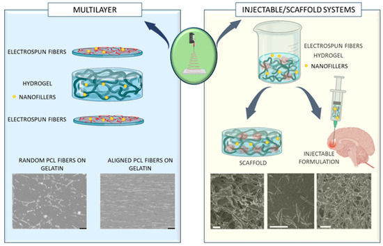 Over the last few years, biomaterials and hydrogels, either natural or synthetic, have been widely investigated for potential use in the brain, not only as growth factors, cell or therapeutic drug delivery carriers, but also in the development of injectable formulations and scaffolds to support and guide the growth of endogenous or exogenous cells after implantation into damaged areas of brain tissue [126,127,128,129,130,131,132]. Even though hydrogels can change the degree of swelling and/or cross-linking in their structure, they are often reported to have poor mechanical properties, with high degradation rates and with a low modulus matching the brain, which may limit their final application. However, for brain applications, they may provide a biocompatible 3D matrix with interconnected pores that fairly mimics the native ECM, with highly controlled properties like biodegradation. As a delivery platform, they may offer chemical and biological smart responsiveness to external stimuli like pH or temperature [133,134,135]. It is important to remember that the hydrogel composition can restrict the ability of cells to adhere and proliferate. Nevertheless, this can be avoided by covalently attaching peptide sequences to the polymer chains of hydrogel, which may affect the activity of embedded cells [136]. However, with the right modification, some hydrogel limitations might be easily overcome. Indeed, hydrogels can be suitably chemically modified to improve the mechanical properties and increase their residence time [137,138,139,140]. Hydrogels can be also modified by using electrospun nanofibers. In addition to mechanically strengthening the hydrogel, electrospun nanofibers provide ECM-mimicking substrates, creating an environment that perfectly replicates the organization of collagen fibers and proteoglycans in the original ECM to enhance cell adhesion and differentiation [141,142]. Indeed, due to their ability to withstand contractile stresses, they are a preferred material for cell attachment sites. Electrospun fibers are also composed, scaled, and topographically manufactured in a tailored way. Compared to other materials, electrospun nanofibers can be easily prepared using a wide range of materials, and they are characterized by good surface chemical properties of adsorbing drugs, high drug loading efficiency, and controlled drug delivery [143,144]. Above all, to meet the specific requirements for the final application, the design of injectable formulations, 2D mats or 3D scaffolds based on electrospun nanofibers involves varying their physical/topographical cues, such as diameter, alignment, density, surface chemistry, and load composition, to endow the nanofibers with different and peculiar properties [145]. Indeed, the structure and morphology of electrospun nanofibers are important factors that support and guide cell growth. At present, a variety of hydrogels and electrospun nanofibers have been widely used in brain research. Natural and synthetic materials with high biocompatibility have been applied for the fabrication of electrospun nanofibers, including collagen, HA, CS, silk, fibronectin, fibrinogen, PLLA, poly(L, D-lactide) (PLA), PCL, PLGA, polystyrene (PS), and polypyrrole (Ppy). There are two different ways to add electrospun fibers into the hydrogels (Figure 8). The first involves building a sandwich model by laminating layers of hydrogel and nanofibers. This technique allows creating a multilayered fibrous hydrogel in a repeatable, predesigned manner, but it does not offer injectability for such approach. The morphology and mechanical properties of the structure can be fine-tuned by varying the layout, classes of fibers and hydrogels employed. To increase the mechanical integrity, hydrogels are typically directly cross-linked with electrospun fibers. Hydrogel precursor solutions can be used as soak solutions to submerge fiber mats or dropped onto previously constructed fiber meshes [146,147]. The second method of hydrogel functionalization with electrospun fibers is simpler and more common. Physical methods, such as solution blending, can be applied to produce neat hybrids and nanocomposite fibrous hydrogels with homogeneous properties by dispersion of the electrospun-fibers within a hydrogel solution. Electrospun fibers—cut into short fibers—can be homogeneously dispersed in a solution using an ultrasonic homogenizer to interpenetrate and entangle through the walls and pores of the hydrogels and became completely integrated in the matrix. Afterwards, the mixture can be successively freeze-dried to obtain porous 3D sponges or aerogels [148]. Chemical cross-linking or temperature-mediated cross-linking among short fibers can be further adopted to modulate multifunctional structure features [149]. It is essential to adjust the composition of electrospun fibers to facilitate fiber dissolution and dispersion with a well-defined architecture in injectable or noninjectable hydrogel solutions [150]. Injectable therapies are beneficial because they are less invasive, which lowers the risk of infection and shortens the recovery period. In addition, injectable hydrogels play a critical role when material needs to be quickly injected into otherwise inaccessible parts of the body, such as neural tissue. Another interesting approach is adding nanofillers, such as inorganic or organic particles, to the hydrogel matrix or decorating/loading fibers with such nanoparticles. In such fibrous nanocomposite systems, hydrogels are the perfect medium for nanofiller dispersion. By boosting bioactivity, mechanical stiffness, magneto-electric features, or enabling regulated release of drugs or growth factors, nanofillers may provide a supportive role. The next sections will independently address each approach, summarizing the latest research on brain tissue applications (Figure 8).