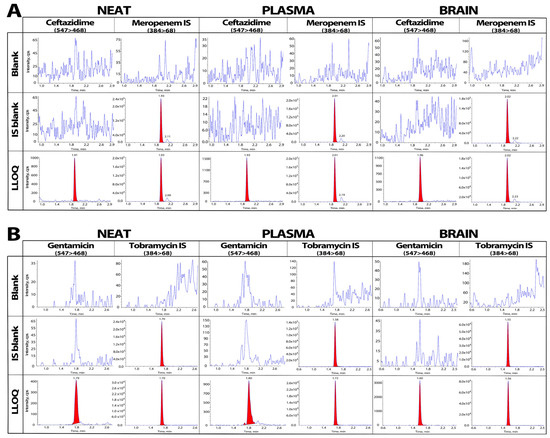 LC-MS/MS chromatograms for ceftazidime and meropenem (A) and gentamicin and tobramycin (B). Blank, blank internal standards (IS) meropenem or tobramycin, respectively, and lower limit of quantification (LLOQ) samples were prepared in neat, plasma and brain matrices. There is no interference observed between analytes and IS. For ceftazidime, the intensity of blank samples is <10% of the intensity observed in LLOQ samples (10 ng/mL for neat and plasma and 5 ng/mL for brain). For gentamicin, the intensity of blank samples is around 16–17% of the intensity observed in LLOQ samples (10 ng/mL for all matrices).