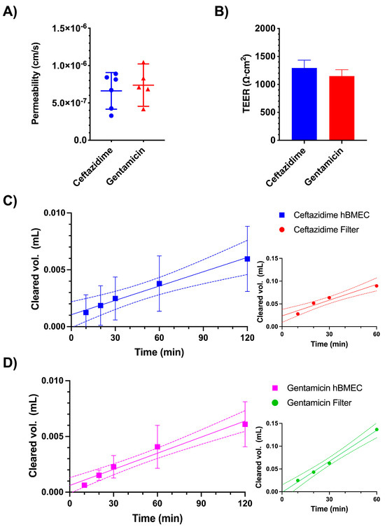 The in vitro permeability was evaluated using induced pluripotent stem cell (iPSC)-derived human brain microvascular endothelial cells (hBMECs) cultured using the Transwell system. The permeability coefficients (P) of ceftazidime and gentamicin were 6.62 × 10−7 ± 2.34 × 10−7 cm/s and 7.38 × 10−7 ± 2.29 × 10−7 cm/s, respectively (Figure 3A). For all the Transwells used in this experiment, we ensured consistent barrier integrity of the hBMEC monolayers by measuring the transendothelial electrical resistance (TEER) values prior to the permeability study, which were 1295 ± 139.0 Ω cm2 for the wells used to measure ceftazidime transport and 1149 ± 113.1 Ω cm2 for the wells used in the gentamicin experiment (Figure 3B). Figure 3C,D illustrate the measured clearance data across the monolayers over 120 min or blank Transwell filters over 60 min for ceftazidime and gentamicin, respectively. The p-values in Figure 3A correspond to the slopes of the linear regression lines after correction for the permeability of the filters without cells.