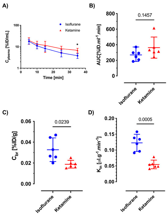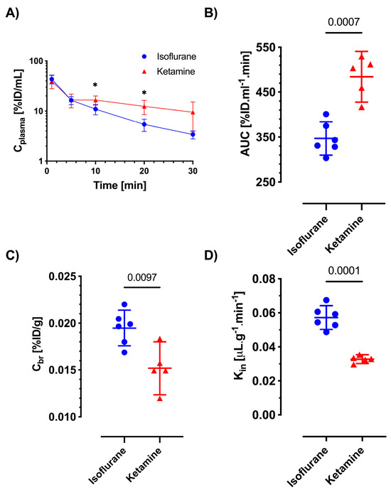 In vivo permeability for ceftazidime under isoflurane and ketamine/xylazine. Mice (n = 5–6) were anesthetized with either isoflurane (1.5–2%) or ketamine/xylazine (100:10 mg/kg) and given an IV bolus of ceftazidime (25 mg/kg). Blood was collected at different time points, and plasma–time profiles and AUCs after the ceftazidime injection are depicted in (A,B). Panel (A) represents mean values ± CI, and 2-way ANOVA was performed for statistical analysis (* = p < 0.05). Brain vasculatures were washed with PBS through cardiac perfusion after 30 min, and the brain concentrations were measured after euthanizing the animals (C). The apparent brain uptake clearance (Kin) values under isoflurane and ketamine are shown in (D). Graphs show individual values, means and CI in (B–D), and statistical analysis was conducted using an unpaired t-test with Welch’s correction, not assuming equal SDs.