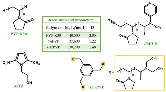 The chemical structures of metronidazole (MTZ) and the employed PVP polymers (K30, linPVP, starPVP) along with a table presenting their macrostructural parameters.