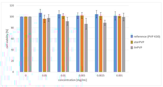 Since both synthesized linPVP and starPVP are new materials, we decided to perform cytotoxicity tests on normal human dermal fibroblasts (NHDFs) first and compare the results with the data obtained for the commercially available PVP K30, which is thoroughly used in pharmaceutical formulations. Herein, it should be briefly mentioned that we carried out measurements with a PVP concentration no higher than 0.05 mg/mL as is usually conducted for macromolecules [55,56,57,58]. Figure 2 presents a graph of the dependence of cell survival on the concentration of the examined compounds. As illustrated, the tested polymers show no cytotoxicity against the normal human dermal fibroblast line. The survival fraction in all cases did not fall below 85%, which indicates the neutral effect of the samples on the proliferation of the tested cell line. The studies revealed that end groups with a CTA moiety in the structure of the synthesized polymer as well as the presence of a star initiator do not affect their cytotoxicity with respect to PVP K30. Such a result is extremely promising in the context of the potential use of these materials as excipients in binary formulations.