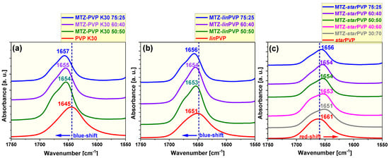 FTIR spectra of the carbonyl stretching region of (a) MTZ-PVP K30, (b) MTZ-linPVP, and (c) MTZ-starPVP binary mixtures at different API–polymer ratios and that of the neat polymers, measured in the supercooled liquid/or glassy states.