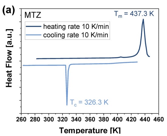 FTIR spectra were collected on a Nicolet iS50 FTIR spectrometer (Thermo Scientific) with a built-in diamond iS50 ATR sampling station in the MIR range of 4000–400 cm−1. Each spectrum was recorded from 16 scans with a resolution of 4 cm−1. The high-temperature FTIR spectrum of MTZ (at the melting point of 438 K) was measured using a GladiATR accessory (Pike Technologies, Madison, WI, USA) coupled with an FTIR spectrometer in the range 4000–400 cm−1 (16 scans; spectral resolution of 2 cm−1).