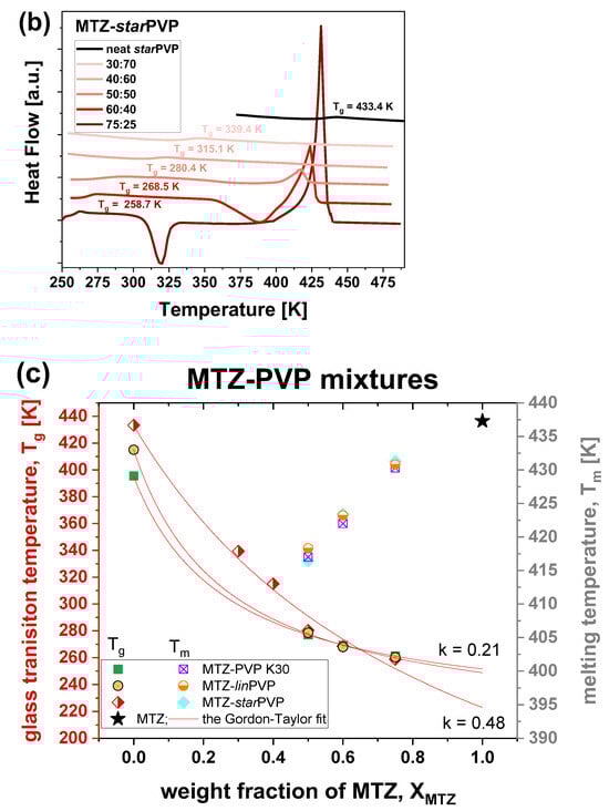 where and are the glass transition temperatures (the subscript 1 refers to the component of the mixture with the lower ), is the weight fraction of component 1, while is the constant, which represents a fitting parameter characterizing the curvature of the vs. evolution. In our studies, the data presented in Figure 4c ( vs. XMTZ plots) were analyzed using Equation (1) with the of API being a fitting parameter. As illustrated, the value of k determined for the MTZ-starPVP system (k = 0.48) is greater compared to the one obtained for MTZ-PVP K30 and MTZ-linPVP ASDs (k = 0.21). There is also a slight difference (~5 K) in the of MTZ estimated from this analysis. The observed difference might be due to the fact that for the BM with the star-shaped polymer, we added two additional points at a higher polymer concentration. For other systems studied herein, it was not possible.