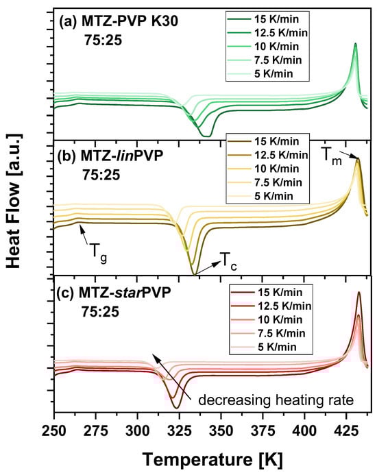 DSC thermograms for non-isothermal measurements of 75:25 w/w binary mixtures: (a) MTZ-PVP K30, (b) MTZ-linPVP, (c) MTZ-starPVP.