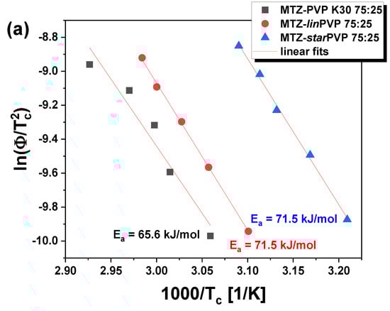 Figure 5 shows representative thermograms for the freshly prepared mixtures that crystallize most rapidly, i.e., MTZ-PVP 75:25 w/w. Note that the same measurements (with various ranging from 2.5 to 15 K/min) were performed for other API-PVP systems, i.e., 60:40 and 50:50 w/w. The values of crystallization temperatures (Tc) for all studied BMs, prepared at various weight ratios, are presented in tabular form in the SMs (see Tables S3–S5). As can be observed in Figure 5, three thermal events are visible during each scan. Except for two endothermic peaks occurring at the lowest and highest T (attributed to the glass transition and the melting, respectively), there is an exothermic peak corresponding to the crystallization of MTZ. It is visible that in the case of each MTZ-PVP system, the Tc values (the peak temperature of crystallization) increase with increasing . In turn, the Tgs and Tms do not significantly vary depending on the heating rate. The analysis of non-isothermal DSC data obtained for all studied systems (Figure 6a) used the Kissinger method [83]: