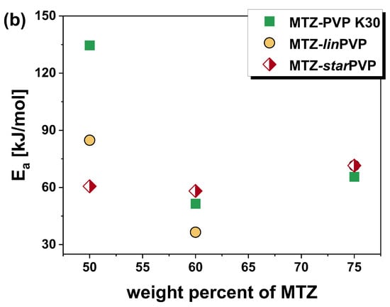 It is well observed that for the MTZ-PVP 75:25 w/w BMs, the values of the Ea for the API crystallization are very similar (65.6–71.5 kJ/mol). The lowest Ea (65.6 kJ/mol) was determined for the mixture with commercial PVP (PVP K30). However, as the polymer content increases in the system, the differences in crystallization energies become greater. Interestingly, in the case of MTZ-PVP 50:50 w/w BMs, Ea changes as follows: EaMTZ-PVPK30 > EaMTZ-linPVP > EaMTZ-starPVP.