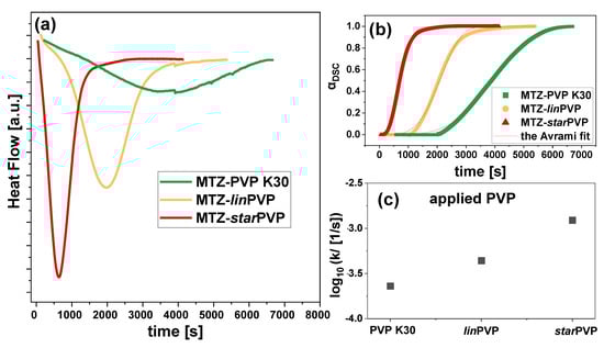 In Figure 7a, we plotted the heat released during the crystallization process versus time. At first sight, it can be seen that the time scale of crystallization of MTZ in various PVP matrices is different. To quantify this observation, the following formula was applied: