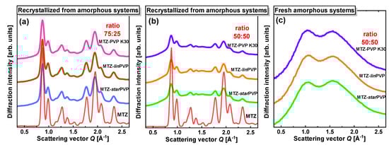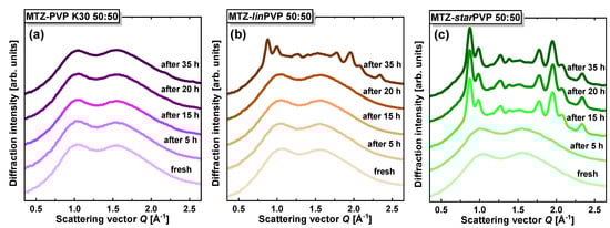 The temporal evolution of the XRD patterns for freshly prepared MTZ-PVP 50:50 w/w binary systems: (a) MTZ-PVP K30, (b) MTZ-linPVP, and (c) MTZ-starPVP.