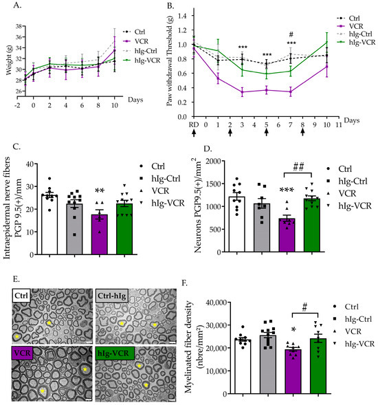 Effect of polyvalent immunoglobulin therapy on a mouse model of vincristine-induced peripheral neuropathy. (A) Mouse weight. (B) hIg therapy (0.5 g/kg/3d) and VCR effect on mechanical sensitivity was evaluated using the von Frey filament test. Black arrows designate hIg injections. n = 9 to 10 mice per group. (C–F) Foot pad skin, sciatic nerve, and DRG were removed at D11. Foot pad skin and DRG neurons were immunostained for protein gene product 9.5 (PGP9.5). (C) Quantification of PGP9.5-positive intra-epidermal nerve fiber. (D) Quantification of DRG neurons positive for PGP9.5. (E) Transversal sciatic nerve sections obtained via electron microscopy. Scale bar = 5 µm. Yellow stars indicate myelinated axons. (F) Quantification of myelinated nerve fibers in sciatic nerve. Data are expressed as mean ± SEM and they were compared using an ANOVA test followed by Tukey post-test, * p < 0.05; ** p < 0.01; *** p < 0.001 VCR vs. Ctrl; # p < 0.05, ## p < 0.01 VCR vs. hIg-VCR. hIg: human immunoglobulins, RD: reference day (functional test was performed before hIg injection), VCR: vincristine.