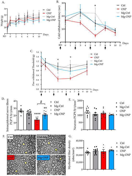 Effect of polyvalent immunoglobulin therapy on a mouse model of oxaliplatin-induced peripheral neuropathy. (A) Mouse weight. (B) hIg therapy (0.5 g/kg/3d) and OXP effects on mechanical sensitivity, evaluated using the von Frey filament test. Black arrows designate hIg injections. n = 8 to 10 mice per group. (C) Cold nociception was evaluated using the cold plate test (4 °C), and each session’s test was performed a few hours after the oxaliplatin injection was administered. Black arrows designate hIg injections. n = 8 to 10 mice per group. (D–G) Foot pad skin, sciatic nerve, and DRG were removed at D11. (D–E) Foot pad skin and DRG neurons were immunostained to obtain protein gene product 9.5 (PGP9.5). (D) The quantification of intra-epidermal nerve fibers was positive for PGP9.5. (E) The quantification of DRG neurons was positive for PGP9.5. (F) Transversal sciatic nerve sections were obtained via electron microscopy. Scale bar = 5 µm. Yellow stars indicate myelinated axons. (G) Quantification of myelinated nerve fibers in the sciatic nerve. Data are expressed as mean ± SEM and they were compared using an ANOVA test followed by a Tukey post-test, * p < 0.05; ** p < 0.01; **** p < 0.0001 OXP vs. Ctrl; # p < 0.05 VCR vs. hIg-OXP. hIg: human immunoglobulins, OXP: oxaliplatin, RD: reference day (the functional test was performed before the hIg injection).