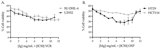 The concentration of OXP needed to produce 50% cell viability was 10.88 µM for the HT29 line and 16.85 µM for the HCT116 line (Table 1). The combination of hIg with OXP at the [IC50] concentration did not negatively interfere with OXP-induced cytotoxicity in either cell line (Figure 4B). At the highest dose (12 mg/mL), hIg did not have an effect on the cytotoxic activity of OXP in HT29 or HCT116.