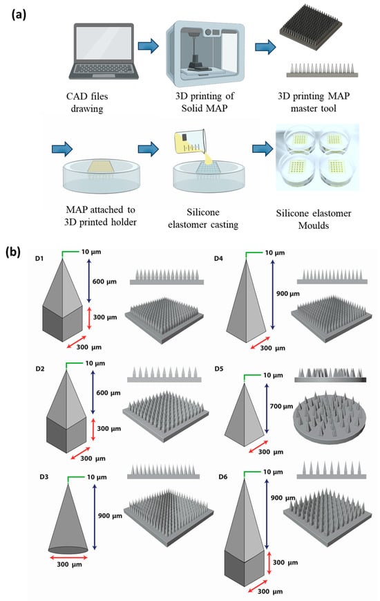 (a) Schematic illustrating the fabrication and manufacture of MAP molds via two-photon polymerization 3D printing. (b) MAP array designs developed for two-photon polymerization 3D printing (except D5).