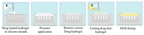 Bilayer CAB Na MAPs were prepared from various CAB Na-loaded hydrogels (to form the first MAP layer) and drug-free hydrogels (to form the second MAP layer) using a positive pressure chamber by either two-step or three-step casting as needed, as depicted in Figure 2 and previously described [24].