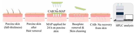 Ex vivo skin deposition studies were conducted to evaluate the efficiency of the MAPs in delivering CAB Na into the skin following administration. These studies were performed using fully excised neonatal pig skin (Figure 3), as described previously [25]. Briefly, the ex vivo skin samples were placed on paper tissue sheets soaked in 10 mM phosphate-buffered saline (PBS) (pH 7.4) solution to maintain skin hydration and placed in a weighing boat. To mimic human skin temperature, the pig skin samples were placed in a preheated incubator for 30 min at 32 °C ± 1 °C. The selected MAPs were subsequently inserted into the skin manually using thumb pressure for 30 s. Afterward, a 13 g cylindrical stainless steel block was placed on top of each MAP to keep it in place, and the skin samples were incubated again at 32 °C ± 1 °C for 24 h. Another weighing boat containing 10 mM PBS (pH 7.4) was placed on top to maintain skin hydration. The inserted MAPs were removed from the skin following 24 h of application, and the skin surface was thoroughly cleaned by applying 3 × 1 mL of PBS (pH 7.4) solution and gently wiping with wet paper tissue. The skin at the MAP application site was then visualized using a Leica EZ4 W stereo microscope and stored in Microcentrifuge tubesat −20 °C until further processing and analysis using the validated HPLC–UV method.