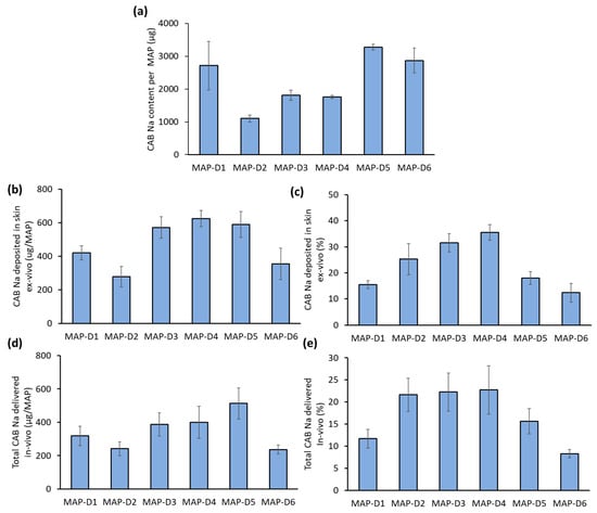 It is worth noting that MAP D6 not only exhibited the lowest amount of CAB Na delivered but also had the lowest delivery efficiency of all six MAP designs. This may be attributed to the large width of the needles, which provided more surface area per needle, resulting in more area of contact with the skin during insertion, which would have caused each needle to encounter more frictional resistance during insertion, resulting in a lower insertion depth. Ultimately, this culminated in lower needle dissolution and drug deposition into the skin.