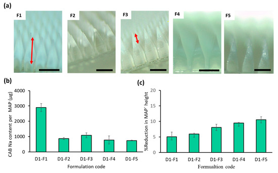 (a) Representative light microscope images of MAPs manufactured using diluted CAB Na-hydrogel formulations F1 through F5, with MAP design D1 showing the localization of the drug into the tip (scale bar = 500 µm). Red arrow shows the drug loaded part in the MAP tips (b) Drug loading per patch (µg) for MAP-D1 with different hydrogel compositions. Data are shown as the mean ± SD (n ≥ 3). (c) Mechanical strength of MAP-D1 prepared by using formulations F1 through F5 (reported as %MAP shaft height reduction after applying a compression force of 32 N against aluminum block following a standardized test using a texture analyzer. Data are reported as mean ± SD (n = 3).