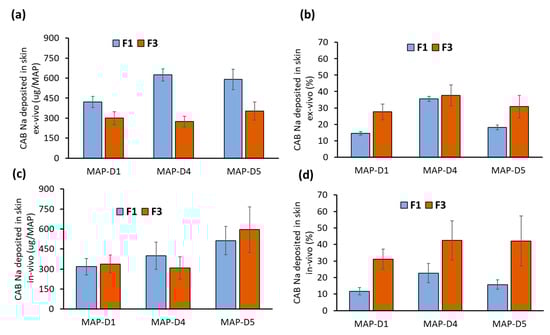 In contrast, when the formulations were taken forward in vivo, we observed that the amount of drug delivered using formulations F3 and F1 was similar (p > 0.05), which contradicts the finding that we observed using ex vivo skin. Such discrepancies in results may be attributed to several factors. One is the overhydration of ex vivo skin relative to in vivo skin, which may augment the faster dissolution of MAPs when inserted into ex vivo skin that leads to more expulsion of the drug to the skin surface [31,32].