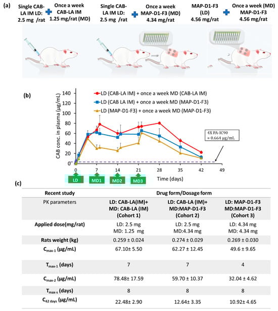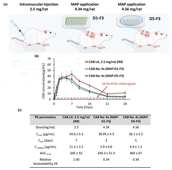 The clinical dose of CAB LA equates to 11.42 mg/kg (800 mg per month administered to a person with an average weight of 70 kg) for the initial dose, or 5.71 mg/kg (400 mg per month administered to a person with an average weight of 70 kg) for the maintenance dose. Here, we used a fixed dose per cohort that best approximated the allometric scaling-based calculated theoretical drug dose (as mg/kg) as required per cohort, rather than using a dose as per the rat’s weight. This was carried out for three reasons: (i) a large number of animals were used in these comprehensive in vivo studies, and numerous blood samples per cohort were collected over prolonged periods, which necessitated conducting the experiments in several consecutive stages, leading to inevitable inter-cohort rat body weight variations; (ii) the difficulty of administering a rat body weight-tailored drug volume from a highly concentrated CAB LA nanosuspension (200 mg/mL), considering the minimum volume that can be accurately administered to a rat using commercially available syringes is 50 µL; and (iii) the difficulty of tailoring MAP drug content per the body weight of each rat, as this could have affected the MAP properties. Therefore, we calculated the IM dose per cohort, assuming that the average weight of a rat aged 12 to 18 weeks is 0.25 kg. For MAP cohorts, four MAPs were applied with the maximum possible dose for the respective MAP design and formulation.