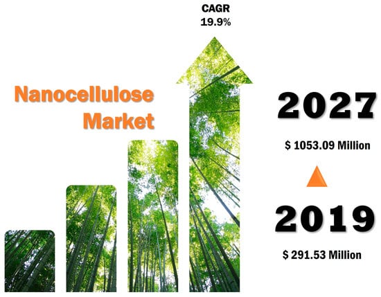 - Fortune Business Insights Nanocellulose Market. Available online: https://www.fortunebusinessinsights.com/nanocellulose-market-104565 (accessed on 1 August 2021).