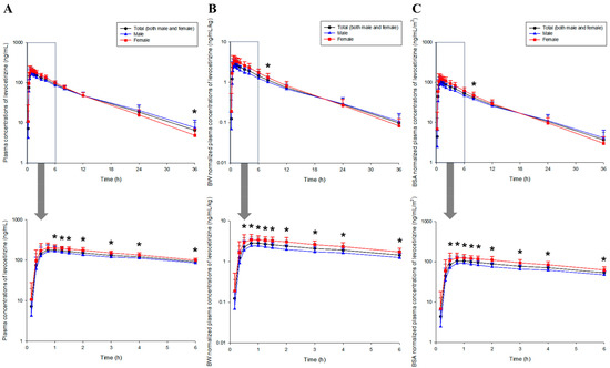 Comparison of pharmacokinetic profiles between genders (24 males and 16 females) following single oral administration of the levocetirizine 5 mg tablet. (A–C) indicate plots based on raw data, plasma concentration normalized to each individual’s body weight, and plasma concentration normalized to each individual’s body surface area (BSA), respectively. Arrows in the graph indicate zoomed-in concentration profile patterns from 0 to 6 h. In the graph, observations are represented as mean and standard deviation by dots and upper vertical bars, respectively. * p < 0.05 compared between males and females.