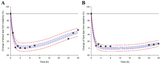 Results of fitted data between the observations and predictions of a pharmacodynamic model established based on the reported pharmacokinetic–pharmacodynamic observations in a population exposed to 5 mg levocetirizine. (A,B) refer to changes in the wheal and flare sizes as a histamine-induced response and a histamine-suppressed response produced by levocetirizine, respectively. Black solid lines and dots represent mean values based on the model predictions and observed values, respectively. The blue and red dashed lines represent the 95% confidence interval and prediction interval of the mean based on the model predictions, respectively. The black dotted lines in the graph refer to the baseline value of the histamine-induced response.