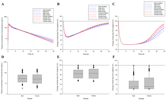 Prediction results of the plasma concentration and drug efficacy (as a change in the wheal and flare sizes) profiles according to single oral exposure to levocetirizine (5 mg) between genders after reflection of covariates in the levocetirizine population pharmacokinetic model. (A–C) refer to the results estimated by applying the median, minimum (min), maximum (max), and mean biochemical parameter values for each gender to the covariate correlation within the model. (D–F) refer to a comparison between genders and the results (0 to 36 h) estimated by applying the mean biochemical parameter values in each gender to the covariate correlation within the model. The black dotted lines in the graph (B,C,E,F) represent the baseline (as no inhibition) of the histamine (H1)-induced response.