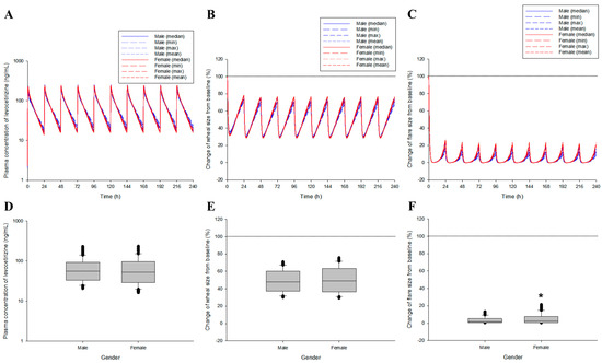 Prediction results of the plasma concentration and drug efficacy (as a change in the wheal and flare sizes) profiles according to multiple oral exposures to levocetirizine (5 mg, 24 h dosing interval) between genders after reflection of the covariates in the levocetirizine population pharmacokinetic model. (A–C) refer to the results estimated by applying the median, minimum (min), maximum (max), and mean biochemical parameter values for each gender to the covariate correlation within the model. (D–F) refer to the comparison of the results between genders at steady state (216–240 h) estimated by applying the mean biochemical parameter values in each gender to the covariate correlation within the model. The black dotted lines in the graph (B,C,E,F) represent the baseline (as no inhibition) of the histamine (H1)-induced response. * p < 0.05 compared to the value in males.