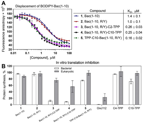 70S ribosomes were isolated from E. coli MRE600 cells according to a published procedure [53]. The binding of BODIPY-Bac(1–10) to 70S E. coli ribosomes was performed according to the following procedure. BODIPY-Bac(1–10) (16 nM) was incubated with ribosomes (from 0.5 nM to 2000 nM) for 2 h at 26 °C in a buffer containing 20 mM of HEPES-KOH (pH 7.5), 50 mM of NH4Cl, 10 mM of Mg(CH3COO)2, 4 mM of β-mercaptoethanol, and 0.05% Tween-20. The binding affinities of peptides 1 and 2, their TPP analogs 3–5, as well as the control compounds for the E. coli ribosome were analyzed via a competition-binding assay using fluorescently labeled BODIPY-Bac(1–10) or BODIPY-ERY, as described before in [38,54]. The fluorescent compound (16 nM) was mixed with ribosomes (84 nM for BODIPY-Bac(1–10) and 46 nM for BODIPY-ERY) in the buffer. Solutions of the tested compounds were added to the obtained complexes to final concentrations ranging from 0.01 to 100 µM. The mixtures were incubated for 2 h at 26 °C, and then the values of fluorescence anisotropy were measured with a VICTOR X5 Multilabel Plate Reader (PerkinElmer, Waltham, MA, USA) using a 384-well plate. The excitation wavelength was 485 nm, and the emission wavelength was 535 nm. From the data obtained, apparent dissociation constants were calculated [55].