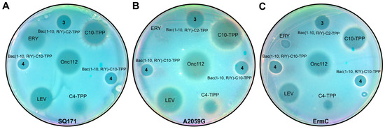 It was shown that mutations in the 23S rRNA at the NPET, such as A2503C, A2059C, and especially the double mutation (A2503C/A2059G), led to increased resistance to Onc112, but not to Bac7(1–35) [5,12]. The authors of [12] explained this effect by the structural features of Onc112 binding in the NPET due to the stacking interaction between the Arg11 of Onc112 and the A2062 nucleotide, which is in close proximity to both A2503 and A2059 [66], while the Arg16 of Bac7 compensates for the loss of interaction with A2062 since it forms a π-stacking interaction with the His69 of the ribosomal protein uL4 [14]. As a result, any mutation in these nucleotides can affect the rotation of A2062 and, as a consequence, interfere with the binding of Onc112 more than in the case of Bac7(1–35). In the structures of analogs 3 and 4, there is no amino acid residue corresponding to the position of Arg11 in Onc112, but they contain a bulky alkyl-TPP substituent directed toward nucleotides A2062, A2503, and A2059 upon binding to the ribosome. Therefore, the TPP analogs of Bac7 were tested on a chloramphenicol-resistant B. subtilis strain (B. subtilis CFR) harboring a plasmid encoding a methyltransferase (Cfr) that modifies the A2503 in the 23S rRNA (Table 1). In addition, the macrolide-resistant E. coli strains SQ171 ΔtolC (A2059G), in which the A2059 nucleotide is replaced with G2059 in the 23S rRNA gene (Figure 3B), and JW5503 (∆tolC) (KanS) ermC, harboring a plasmid encoding a methyltransferase (ErmC) that catalyzes the methylation of A2058 in the 23S rRNA, were used (Figure 3C).