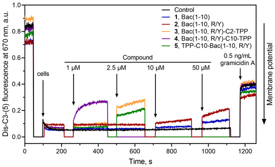 Bac(1–10, R/Y)-C10-TPP (4) at a concentration of 1 µM caused a rapid decrease in the membrane potential of B. subtilis to a level similar to that observed in the presence of gramicidin A (Figure 5). A decrease in the membrane potential, to a somewhat lesser extent, was observed in the presence of TPP-C10-Bac(1–10, R/Y) (5) at a concentration of 2.5 µM. These effects were expected because both these compounds contain a decyl-TPP moiety in their structures. Moreover, in the case of Bac(1–10, R/Y)-C2-TPP (3), containing a short ethyl linker between the TPP and the C-terminus of the peptide, there was also a release of the fluorescent dye from cells, which indicated a decrease in the membrane potential of B. subtilis. It is possible that the combination of several positive charges and a hydrophobic TPP group in this amphiphilic compound with a linear flexible structure might contribute to its interaction with negatively charged lipids (in particular, cardiolipin) in the B. subtilis membrane and promote peptide accumulation on the bacterial surface [71,72]. This also does not exclude the possible interaction of compound 3 with endogenous fatty acids, as happens in the case of the penetration of alkyl-TPP derivatives through the mitochondrial membrane [69]. Peptides 1 and 2 did not affect the membrane potential, even at a concentration of 50 µM.