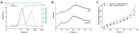 (A) Volume-based estimation of the size distribution (black) and cumulative volume-based size distribution (green) of lysozyme (straight line) and bovine serum albumin (BSA) (dashed line) (n = 3, mean). (B) X-ray powder diffraction pattern of bovine serum albumin (BSA) and lysozyme (n = 1). (C) Vapor sorption (filled symbols) and desorption (open symbols) profiles of lysozyme (squares) and bovine serum albumin (circles) (n = 1).