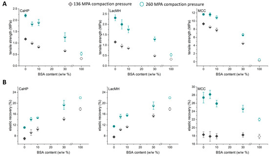 Physical mixtures of amorphous BSA powder and three common excipients (LacMH, CaHP, and MCC) were prepared at different concentrations of BSA. The tablets were compacted using a compaction simulator at two different compaction pressures (136 MPa and 260 MPa), demonstrating typical low and high compaction pressures in an industrial setting [29]. The characteristic tablet parameters, such as tensile strength and elastic recovery, were monitored with an increasing BSA content (Figure 2A,B). The BSA protein was also compacted as a pure powder to rationalize the effect of BSA in binary blends. It was observed that pure BSA formed coherent compacts, however, with a low tensile strength of 0.3 and 0.6 MPa at the two compaction pressures (136 and 260 MPa) (Figure 2A).