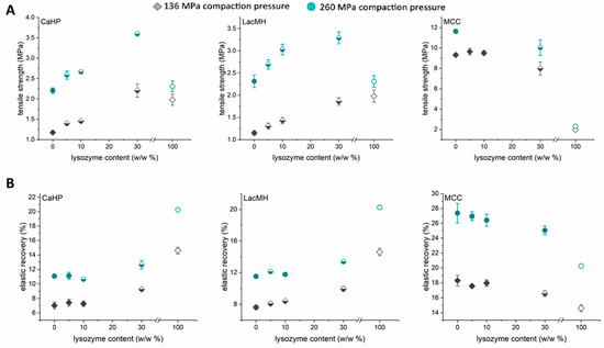 As a second model protein, amorphous lysozyme powder with a smaller mean particle size than BSA was used (Figure 1). Similarly to the BSA experiments, lysozyme was added into three different excipients (LacMH, CaHP, and MCC) at increasing weight fractions (5, 10, and 30 w/w%). The compaction of lysozyme alone resulted in tablets with a tensile strength of 2.0 MPa at a 136 MPa compaction pressure and 2.3 MPa at a 260 MPa compaction pressure (Figure 3A). These results are in good agreement with Wei et al. (2019), where compacted pure lysozyme had a tensile strength of ~2 MPa at a 150 MPa compaction pressure [12].