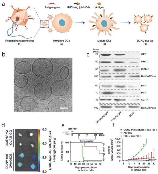 Genetic engineering of DCs. (a) A diagram showing the procedure for creating ASPIRE. (b) Cryo-electron microscopy imaging of cellular vesicles; the scale bar is 50 nm. (c) Western blot analysis of membrane proteins from DCNV-rAd-GFP cells shows similar amounts of proteins as those on the parental cells. (d) Fluorescent signals detected in the draining of inguinal LNs. (e) Curves of survival for mice treated and untreated. (f) The tumor progression graphs of B16F10. Reproduced with permission [69]. Copyright 2022, Nature Nanotechnology.