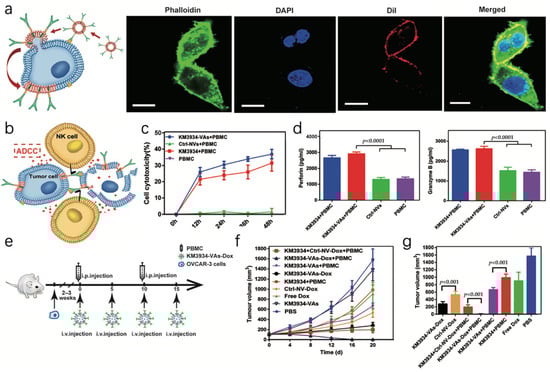 Cellular vesicles exhibit complete monoclonal antibodies. (a)After incubating HepG2 cells with DiI-labeled hGC33 cellular vesicles, a display of energy-dependent membrane fusion mediated by antibodies was demonstrated; the scale bar is 20 μm. (b) The cytotoxic activity mediated by hGC33-Bio-MVs involves antibody-dependent cellular cytotoxicity (ADCC). (c) The KM3934-VAs mediate the cytotoxicity activity of ADCC. (d) In a 24 h time period, ELISA was used to assess NK cell activation and cytokine production (perforin and granzyme B). (e) Illustration depicting the integration of various therapeutic approaches. (f) Tumor expansion was assessed throughout the duration, and the volume of tumors in each group was computed on the 20th day. (g) Tumor volume of each group was calculated on the 20th day. Reproduced with permission [71]. Copyright 2019, Wiley-VCH.