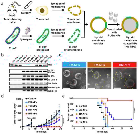 Bacteria are common pathogens that are eliminated by immune cells to prevent severe infections. In this context, it is also possible to consider them natural substances that enhance the body’s immune system, promote innate and adaptive immune responses, and ultimately combat cancer [76]. This study created a hybrid vaccine by co-extruding nanoparticles with both tumor cell membranes and bacterial cytomembranes (Figure 4a). Figure 4b shows that FtsZ, a well-characterized protein involved in bacterial cell division, was found in both Escherichia coli cytoplasmic membrane nanoparticle vaccines (EM-NPs) and hybrid membrane nanoparticle vaccines (HM-NPs). Additionally, several mammalian membrane proteins were present in tumor cell membrane nanoparticle vaccines (TM-NPs) and HM-NPs, such as Na+/K+-ATPase, IM CVa, IM Core 1, OM Porin, Matrix CypD, and IMS CytC. Moreover, immunogold staining allowed Escherichia coli cytoplasmic membranes and tumor cell membrane-specific markers to be identified directly on the HM-NPs by measuring Na+/K+-ATPase and FtsZ levels. This was followed by TEM imaging (Figure 4c). As depicted in Figure 4d,e, in the 4T1 tumor model, it was discovered that fusion vesicles had significantly greater tumor-suppressive effectiveness compared to the mere combination of TM-NPs and EM-NPs. Moreover, the HM-NP vaccine enhanced tumor suppression in mice, leading to a survival rate of approximately 92% within 60 days [77]. For personalized tumor immunotherapy, researchers conducted another study where they combined outer membrane vesicles from bacteria with the membrane of tumor cells, aiming to enhance innate and adaptive immunity simultaneously. An accumulation of fusion vesicles in the inguinal lymph nodes was observed, which exhibited potent inhibitory effects on the growth of tumors and the spread of cancer to lung metastasis [78].