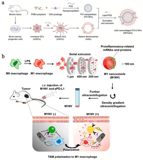 Stimulating immune cells to express endogenous antitumor substances and then extruding vesicles is also an essential strategy. Under suitable preparation, it is believed that activated or polarized immune vesicles retain the mRNA and miRNA contents of the original cells [79]. An intriguing endeavor in the field of research involved the fusion of mature DC vesicles with nanoparticles containing oxaliplatin. Chemotherapy resulted in ICD, and T cells were activated by mature DC vesicles by displaying tumor antigens, thereby enhancing antitumor immunity (Figure 5a) [80]. According to another investigation, the mRNA levels of various pro-inflammatory cytokines were found to be high in nanovesicles derived from M1-type macrophages. As a result of these nanovesicles, macrophages were shown to become polarized towards M1 and CD8+ T cells infiltrated into tumors (Figure 5b) [81].